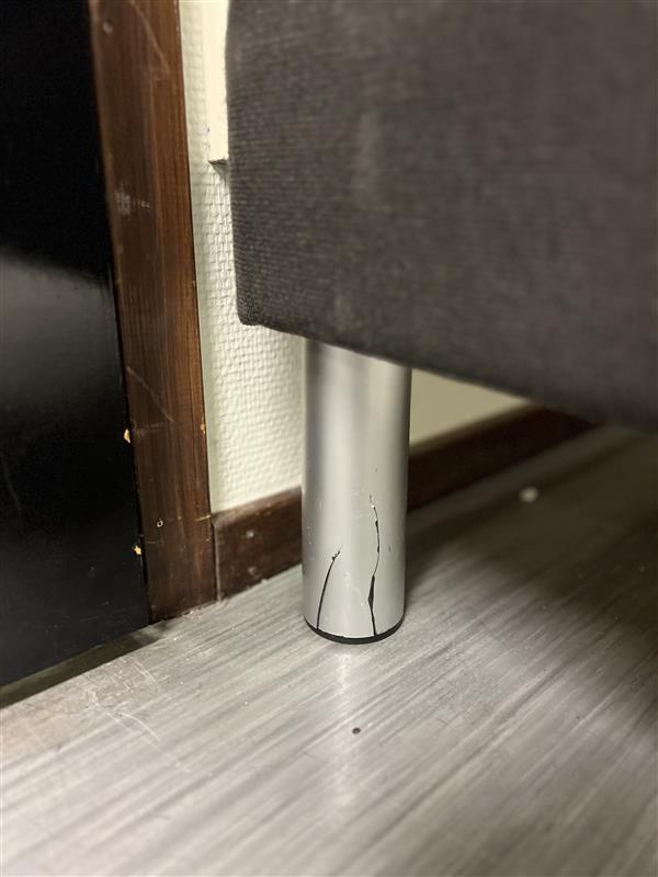 Stabil säng med en bredd på 120 cm och tillhörande madrass. Produkten är begagnad och i gott skick med normalt bruksslitage. En spricka finns i ett av sängbenen men detta påverkar inte sängens funktion eller stabilitet. För mer information hänvisas till bild.