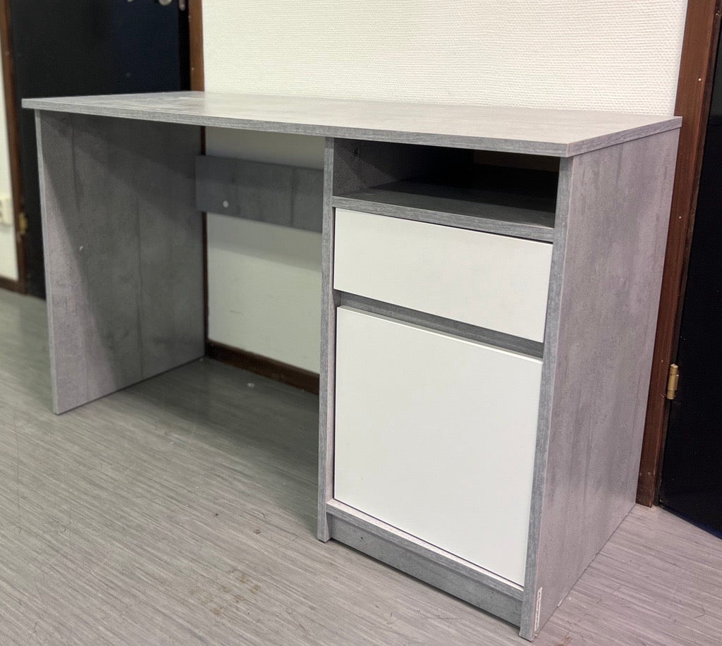 Skrivbord Billund från Jysk. Det är i nyskick utan repor eller skador och har endast använts varsamt. Skrivbordet har en modern design i betonglook med vita fronter och erbjuder bra förvaring med ett öppet fack samt två rymliga lådor.